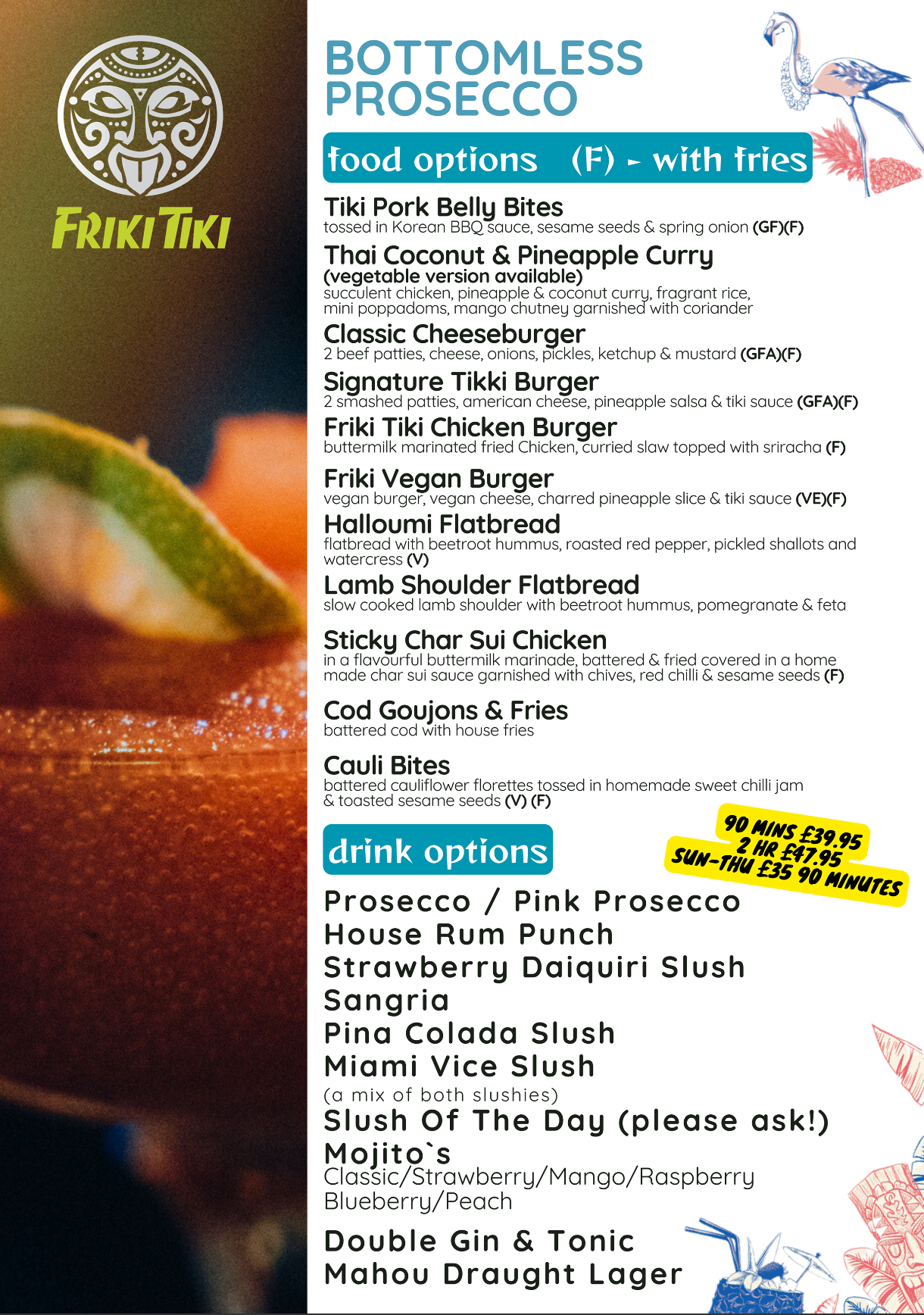 At Friki Tiki, we’re turning brunch into the ultimate celebration. Think 90 minutes of indulgent eats, unlimited sips and a themed party vibe that’ll have you dancing off your pancakes.